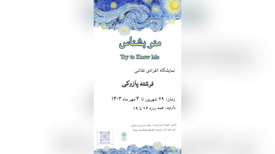 نمایشگاه انفرادی نقاشی «منو بشناس» از امروز در فرهنگسرای ابن‌سینا آغاز به کار می‌کند.