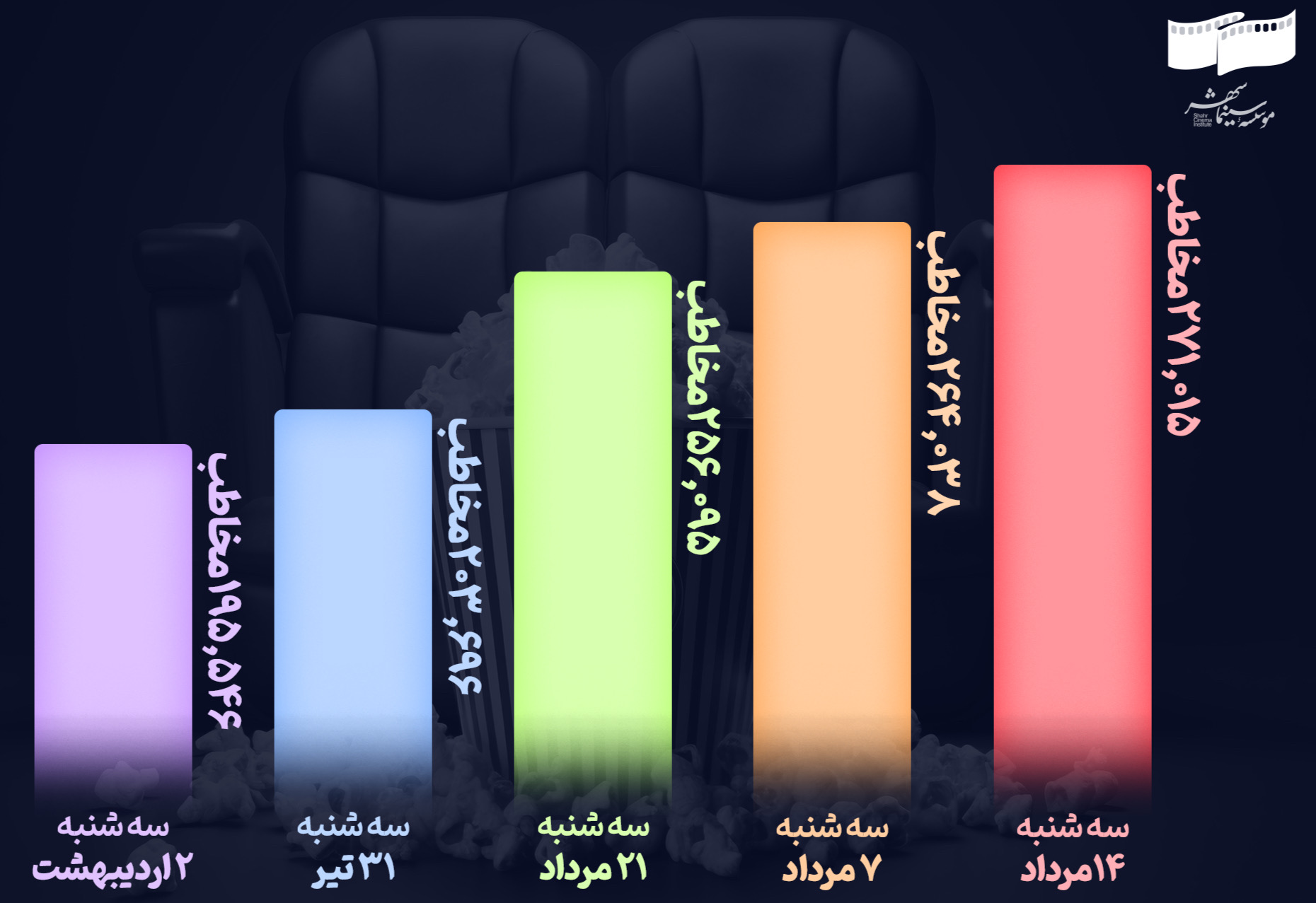 با شروع مرداد و آغاز اکران فیلمهای تازهای همچون «زن و بچه» (سعید روستایی) و «مرد عینکی» (کریم امینی) و همچنین تداوم اکران فیلم پرمخاطب «پیر پسر» (اکتای براهینی)، بار دیگر میزان استقبال مخاطبان از آثار سینمای ایران سیر صعودی به خود گرفت. با وجود اینکه هنوز یک سهشنبه دیگر از این ماه باقی مانده، اما تاکنون نزدیک به ۸۰۰ هزار نفر در سهشنبههای مرداد ماه راهی سینماها شدهاند.