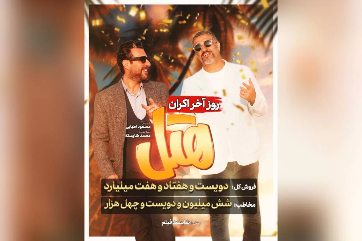 به گزارش «وقت سینما»، در حالی که کمدی سینمایی «هتل» به کارگردانی مسعود اطیابی و تهیه کنندگی محمد شایسته همچنان با فروش هفتگی یک میلیارد و ۶۰۰ میلیون تومان و علی رغم اضافه شدن فیلمهای نوروزی، دومین فیلم گیشه هفتگی سینماهای ایران محسوب می شود، سازمان سینمایی امروز (سه شنبه 29 اسفند ماه) را آخرین روز اکران این فیلم پرمخاطب اعلام کرده است.