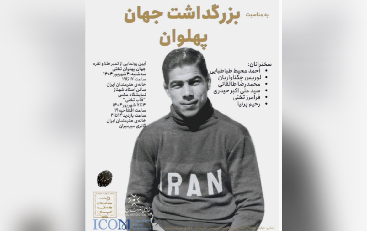 مراسم «بزرگداشت جهان پهلوان» سهشنبه ۴ شهریور ۱۴۰۴ ساعت ۱۷ تا ۱۹ در سالن استاد شهناز خانه هنرمندان ایران برگزار خواهد شد.