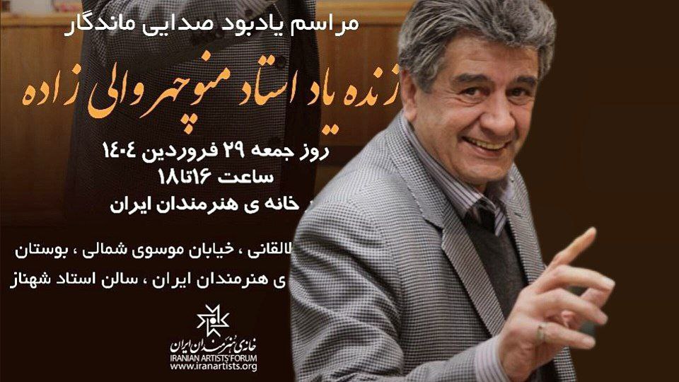 به گزارش رسیده، مراسم یادبود صدایی ماندگار، زندهیاد استاد منوچهر والیزاده عصر جمعه (۲۹ فروردین ۱۴۰۴) در خانه هنرمندان ایران برگزار خواهد شد. در این مراسم قرار است اهالی هنر و همکاران این هنرمند فقید درباره او صحبت کنند.