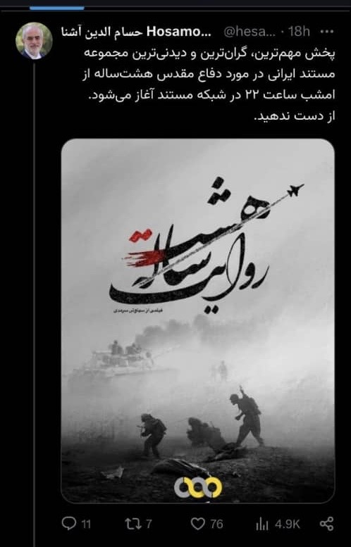 پخش مجموعه مستند «روایت هشت ساله» به کارگردانی و تهیهکنندگی سیاوش سرمدی از شبکه مستند سیما از پنجشنبه (۲۹ آبان ماه) آغاز شد.