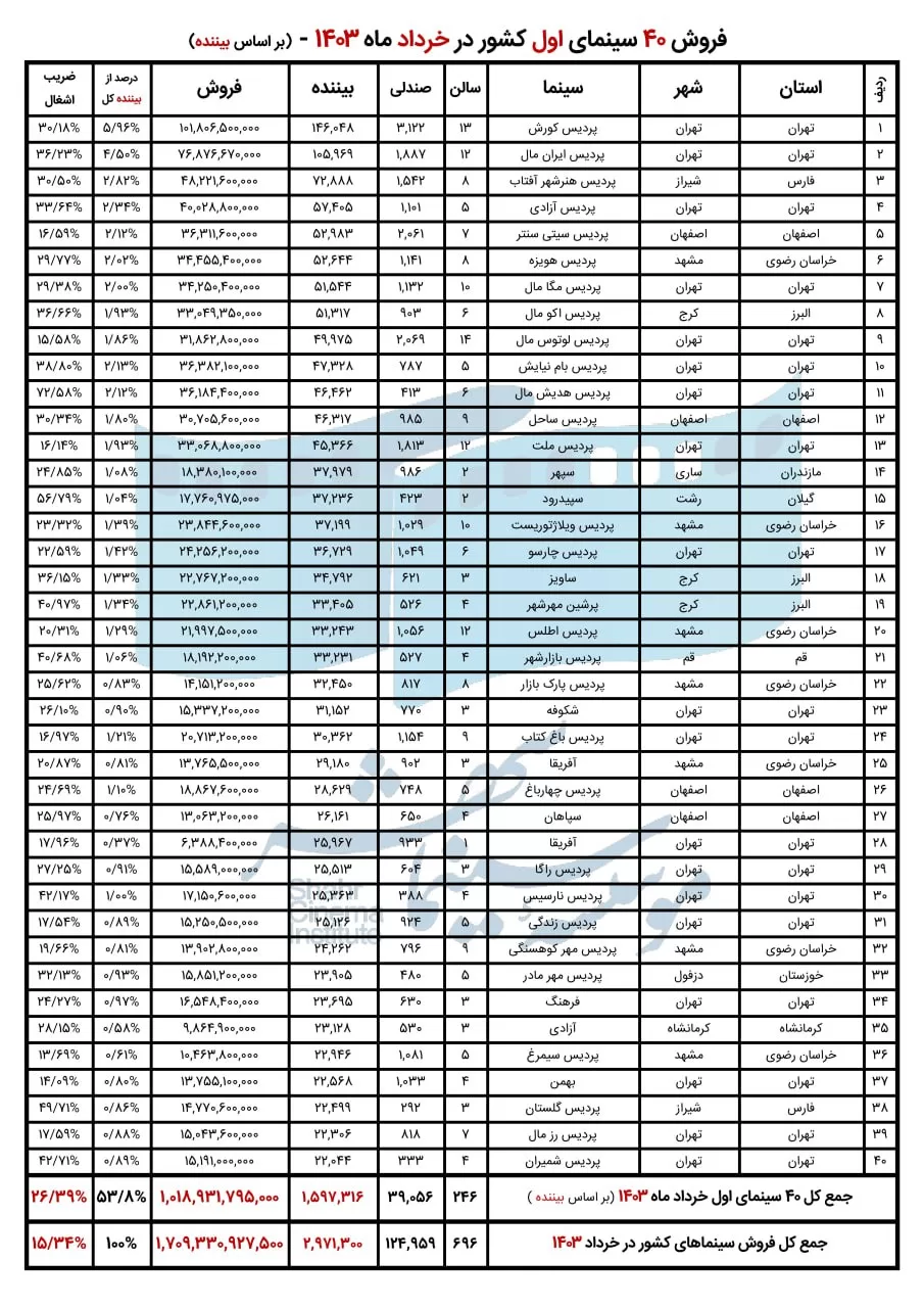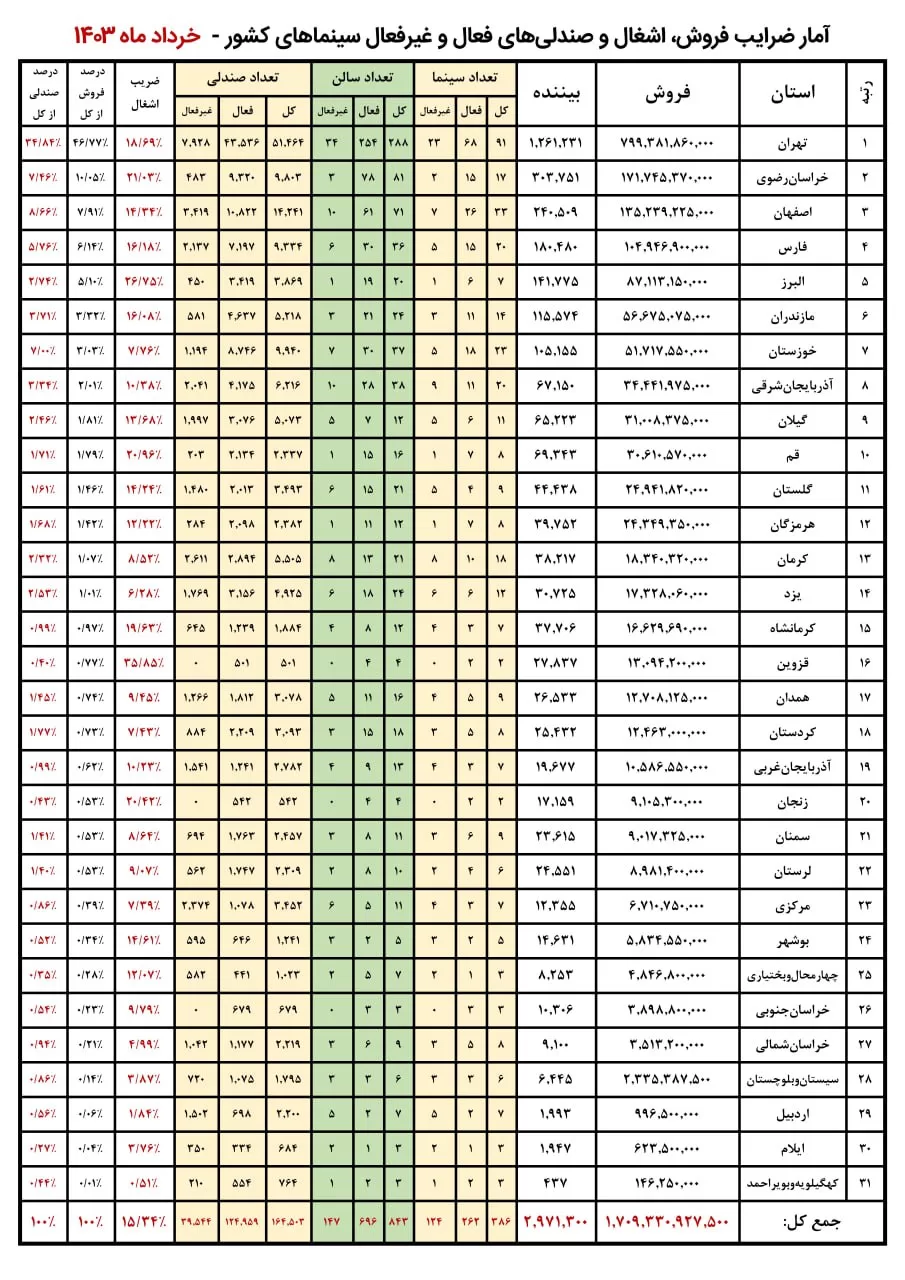 سینماهای تهران، شیراز و اصفهان به ترتیب پربینندهترین و پرفروشترین سینماهای کشور در سومین ماه سال 1403 بودند.