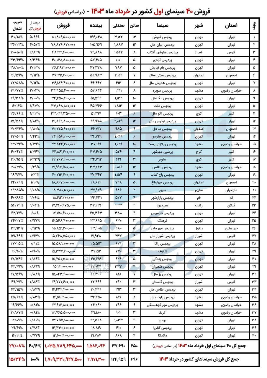 به گزارش «وقت سینما» و به نقل از موسسه سینماشهر، در ماه گذشته یک میلیون و 597 هزار و 316 نفر در خرداد ماه به سینما رفتند. همچنین 60 درصد از فروش کل سینمای ایران در خرداد ماه 1403 مربوط به 40 سینمای اول کشور در این ماه بود و جمع کل فروش این سینماها بیش از 103 میلیارد و 578 میلیون تومان اعلام شد.