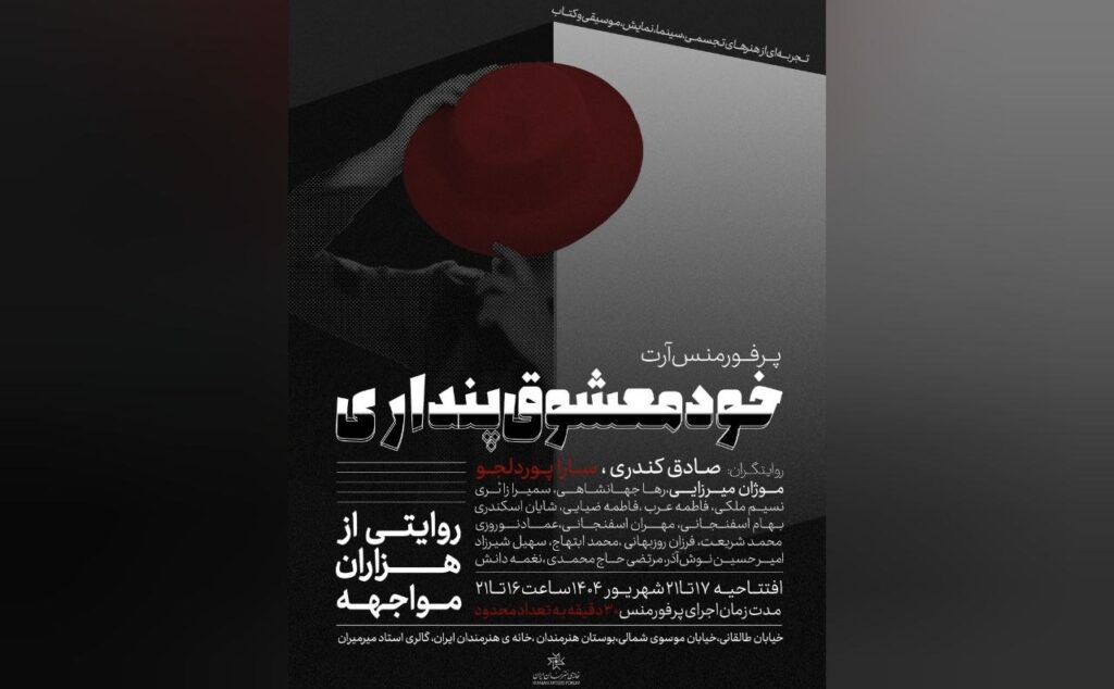 پرفورمنس «خودمعشوقپنداری» به مدت پنج شب از ۱۷ تا ۲۱ شهریور در خانه هنرمندان اجرا میشود. به گزارش «وقت سینما» و به نقل از روابط عمومی اجرا، پرفورمنس آرت «خودمعشوقپنداری» بر اساس …