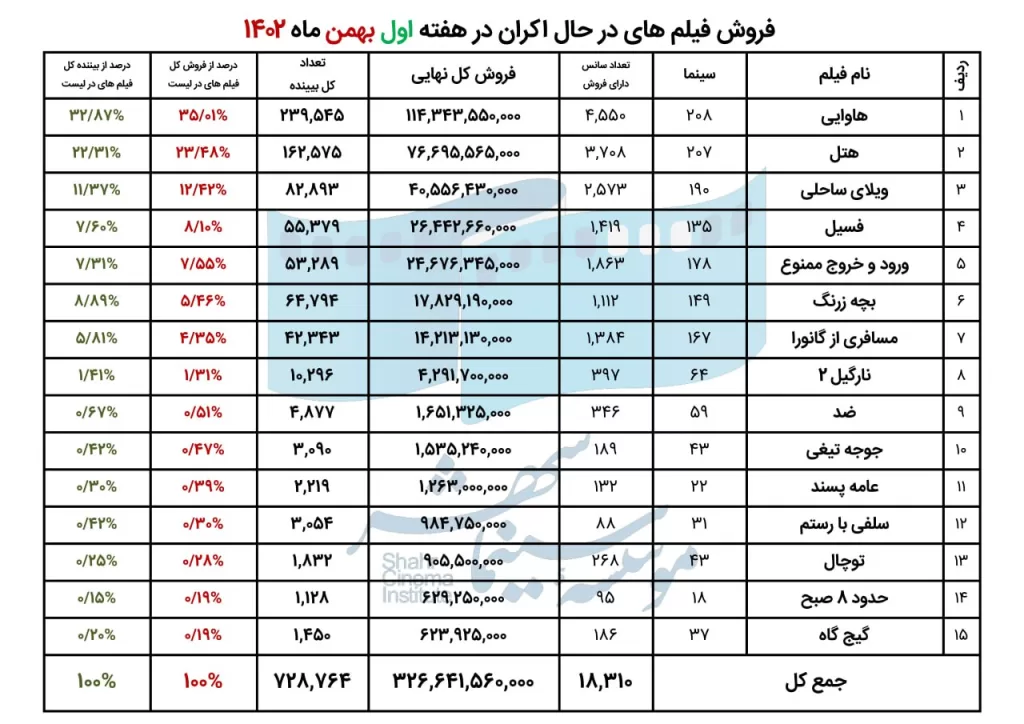 فروش سینمای ایران در هفته اول بهمن اعلام شد