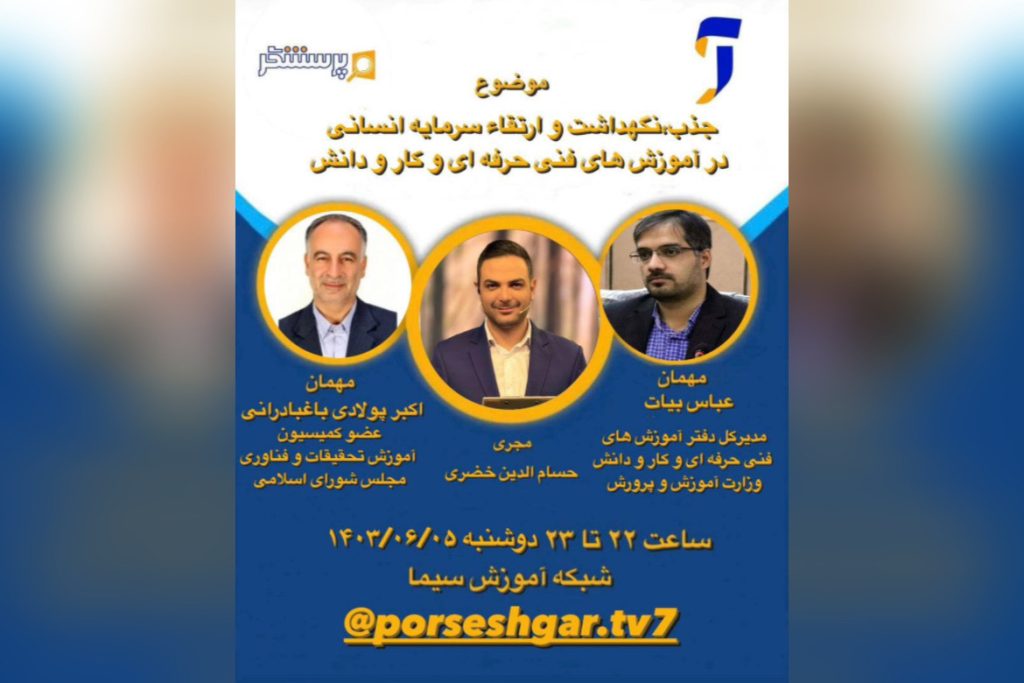 برنامه «پرسشگر» دوشنبه (۵ شهریور ماه) با موضوع جذب، نگهداشت و ارتقاء سرمایه انسانی در آموزشهای فنی حرفهای و کار و دانش روی آنتن میرود. به گزارش رسیده، عباس بیات، مدیرکل دفتر …